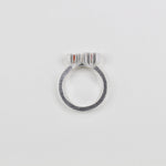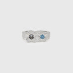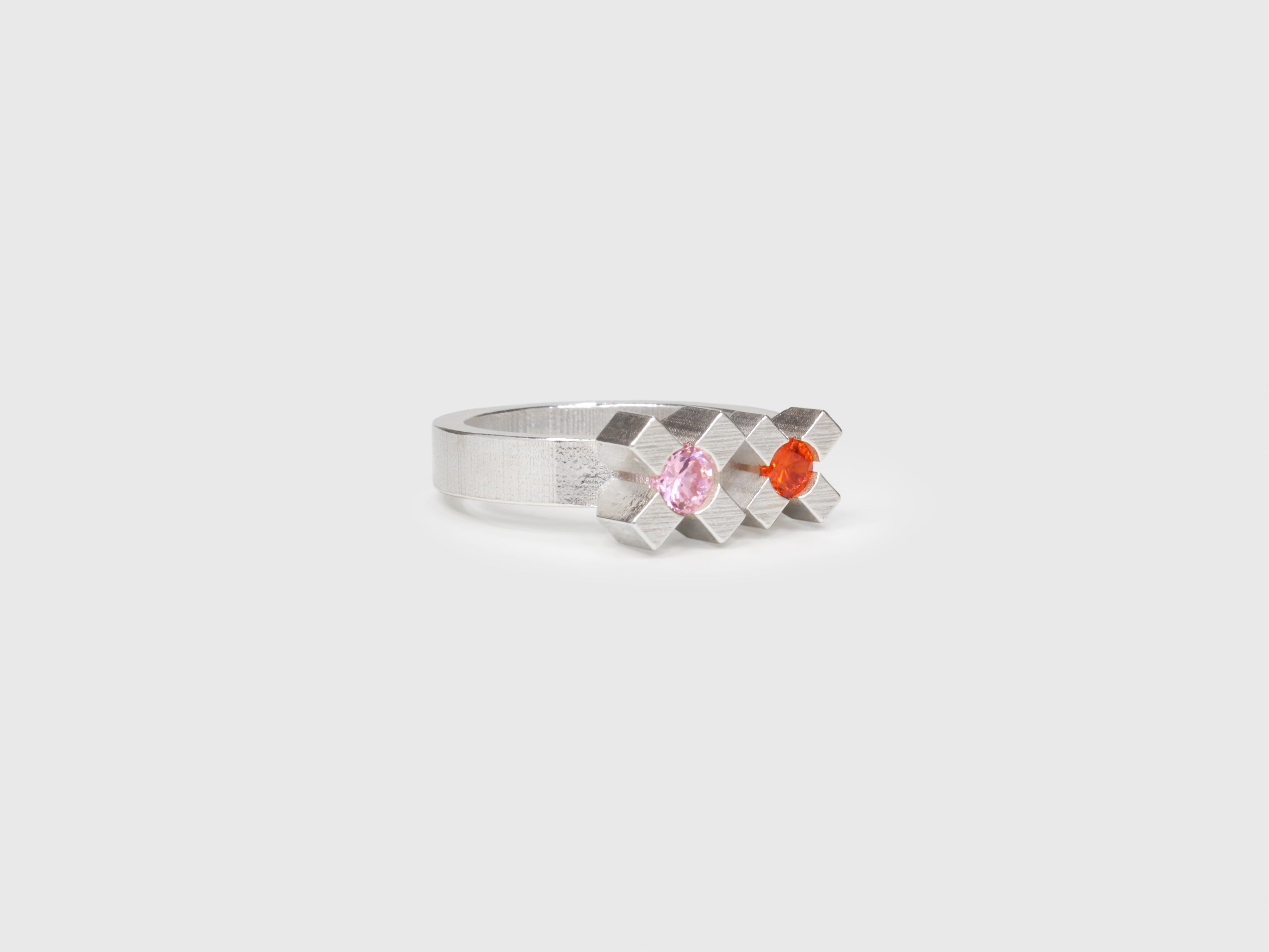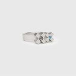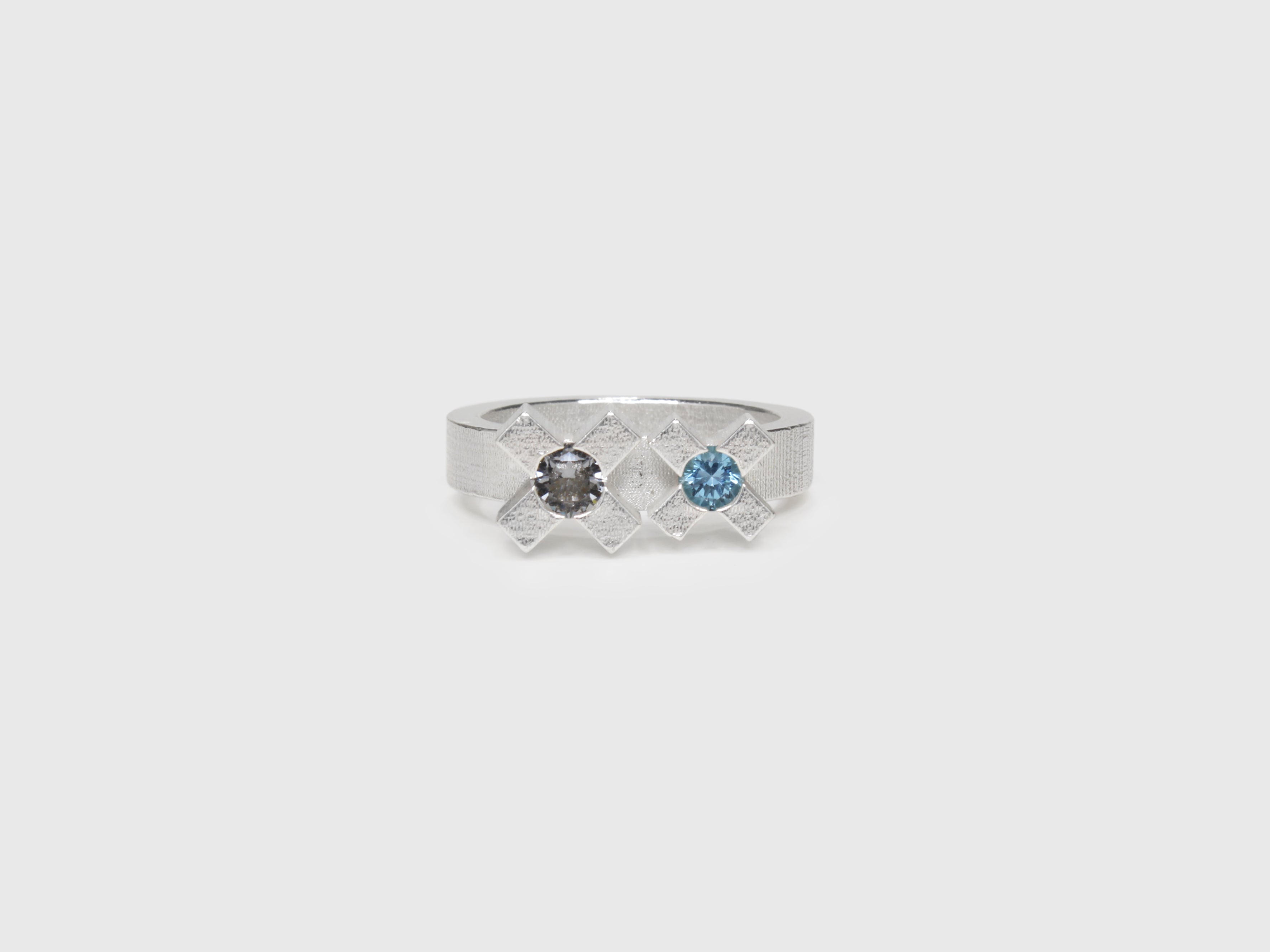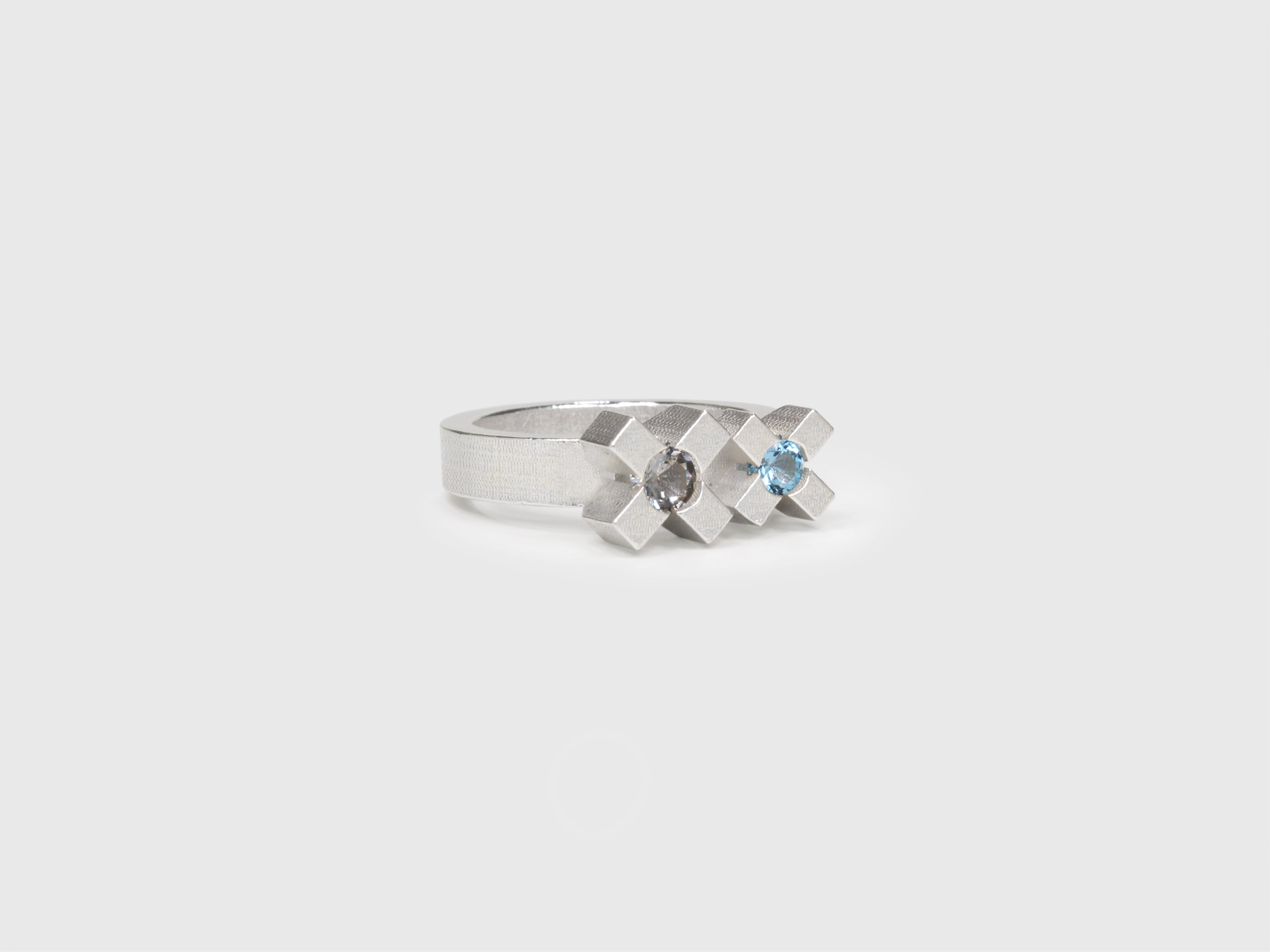 A dramatic and contemporary rendition of a Toi et Moi ring. Square pillars, beveled at the base, rise from a thick rectangular band to clutch two different sized recessed gems. Texture from the 3D printing process complements the perfect geometric structure.