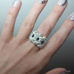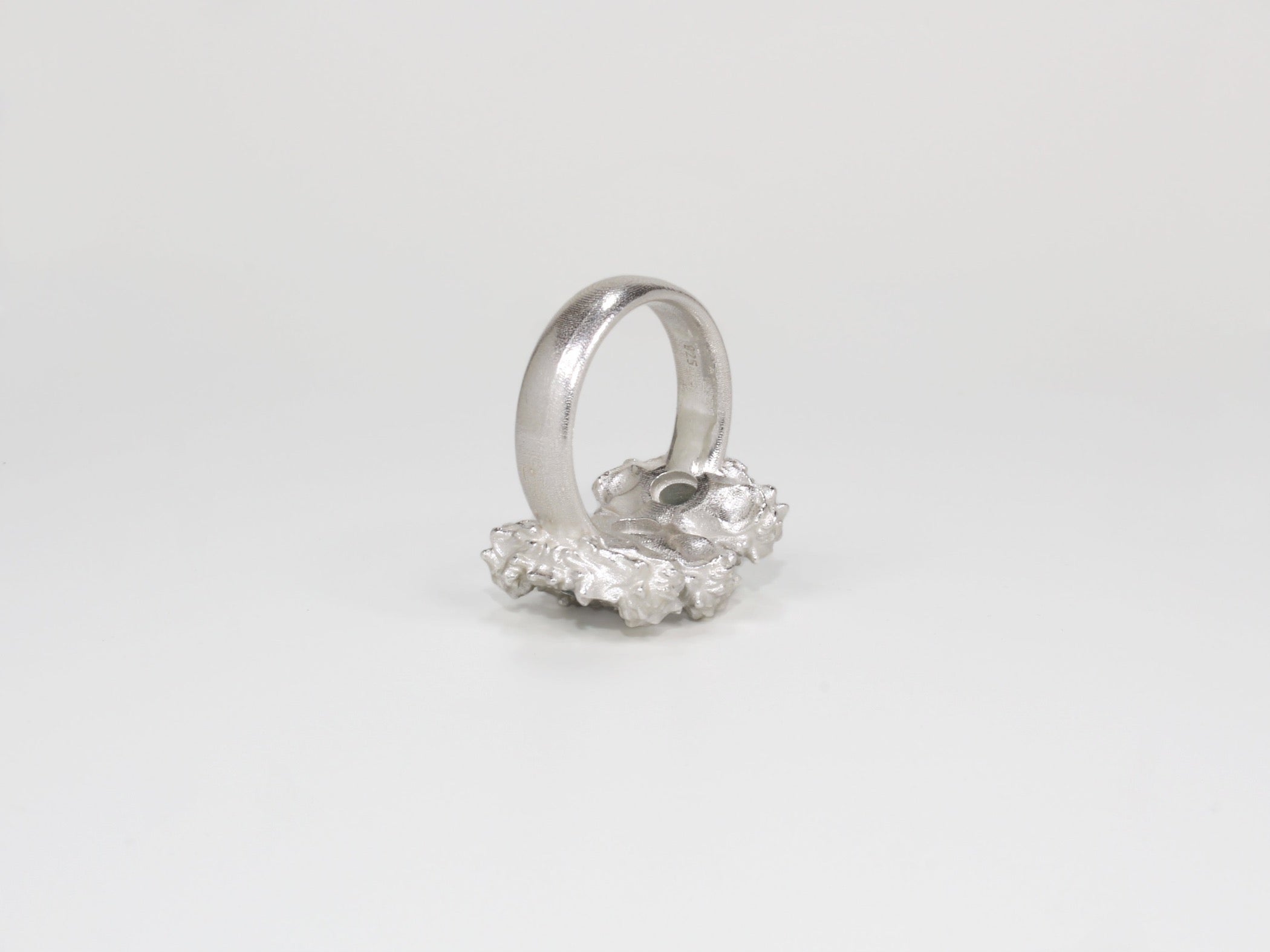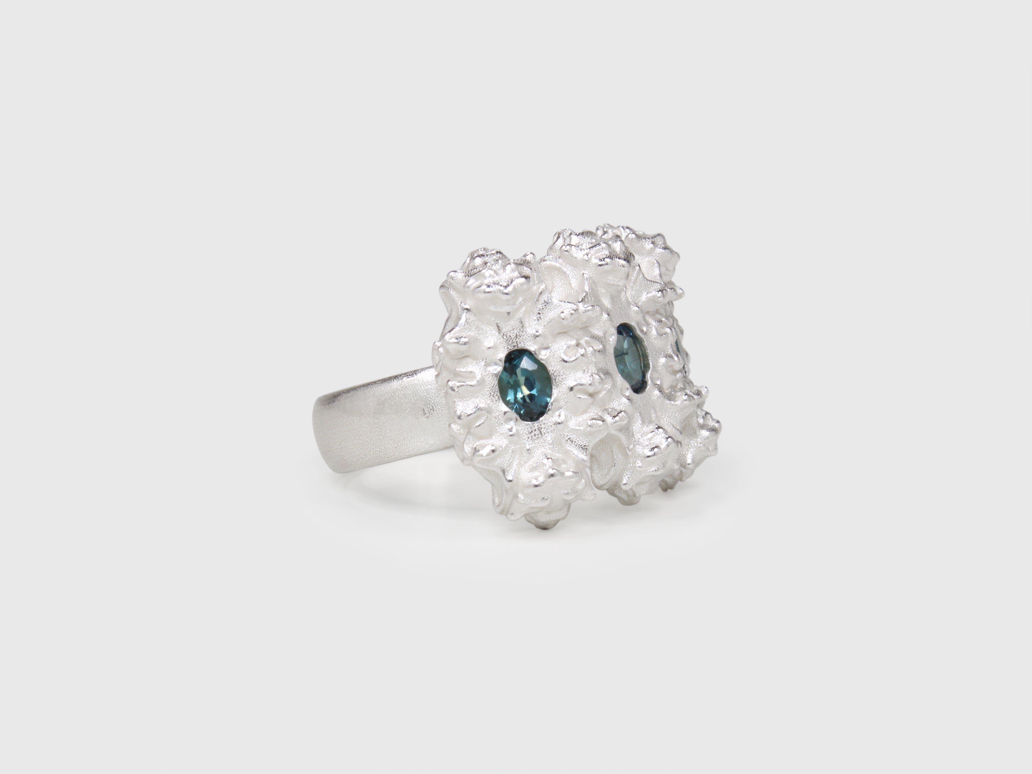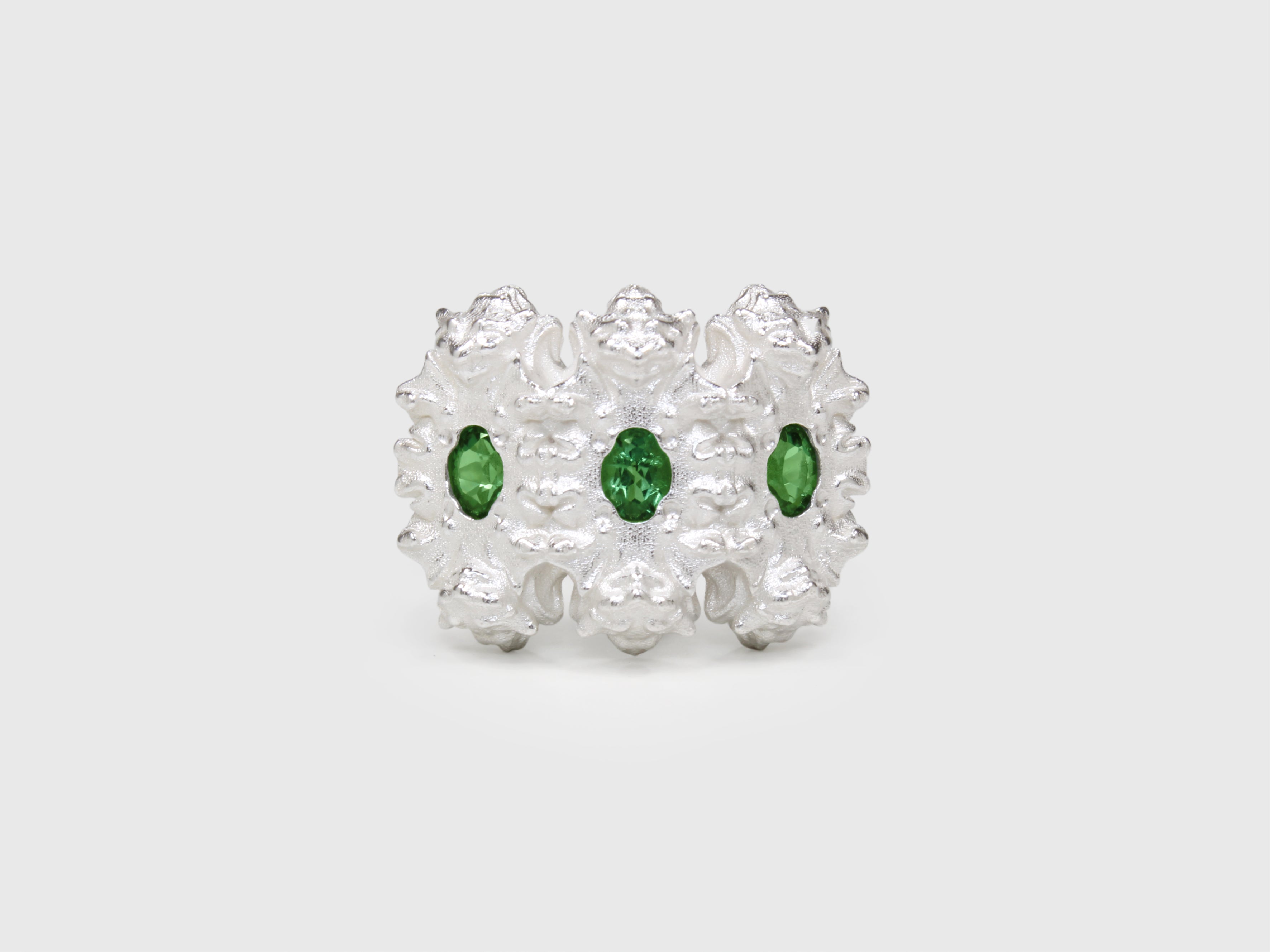 Three gems are cradled deep in a triptych of strange and complicated forms, from which odd faces appear. It is part of human nature to see patterns and faces in our surroundings.