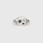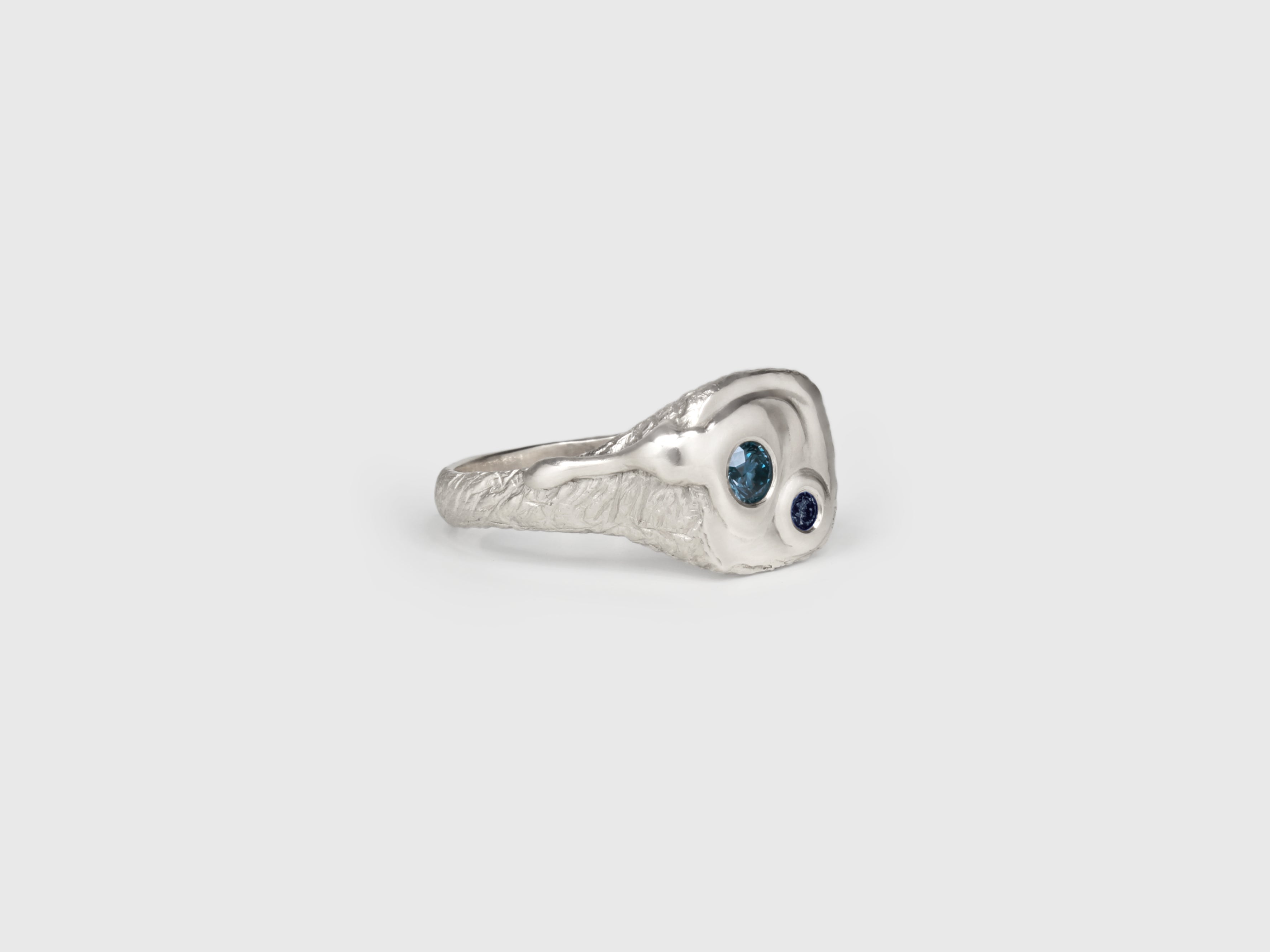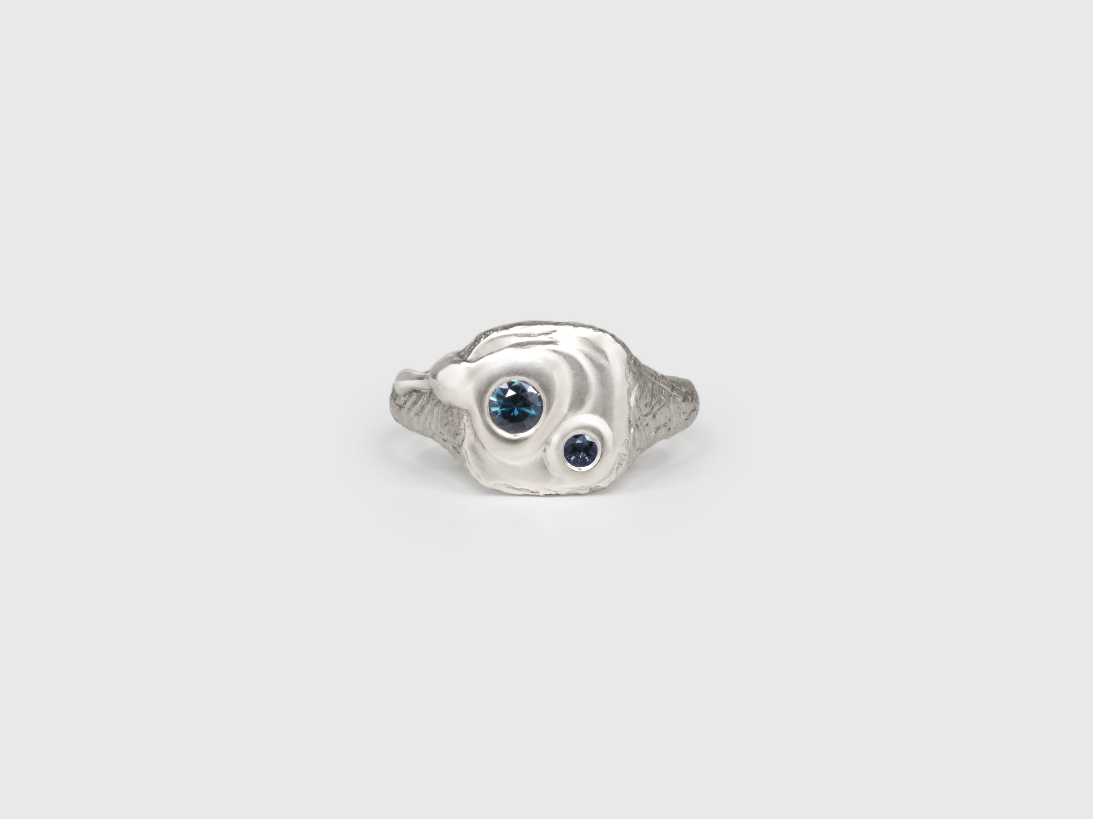 In a luxuriously tactile play on the phases of matter, a soft square signet is gouged and melted. Seemingly viscous metal pools and dribbles slowly over one shoulder and a pair of blue sapphires sink and settle into the surface.