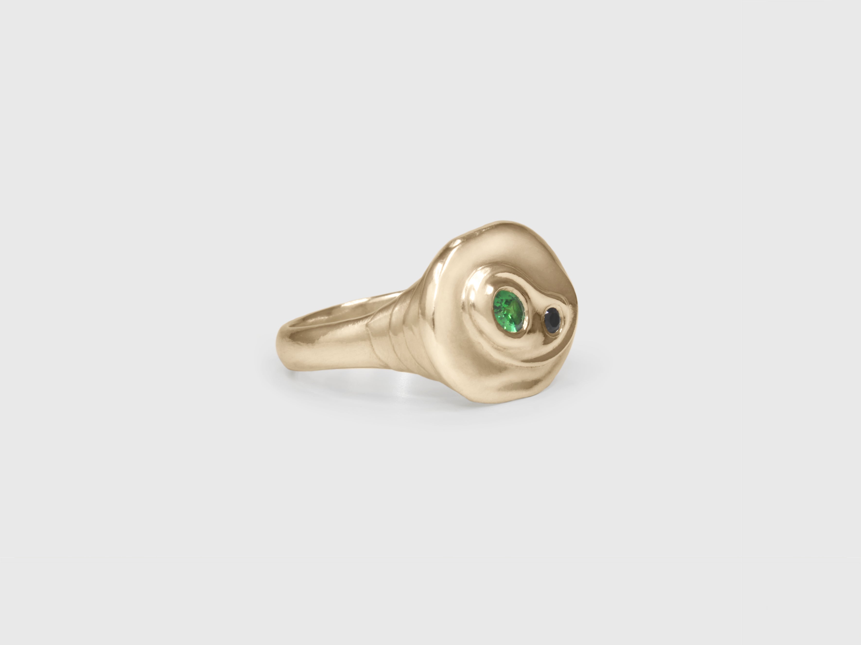 Liquid flows in a circular current and drips gently over the edge. A tsavorite garnet and black spinel appear adrift in the motion.