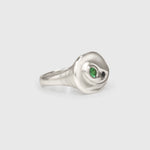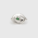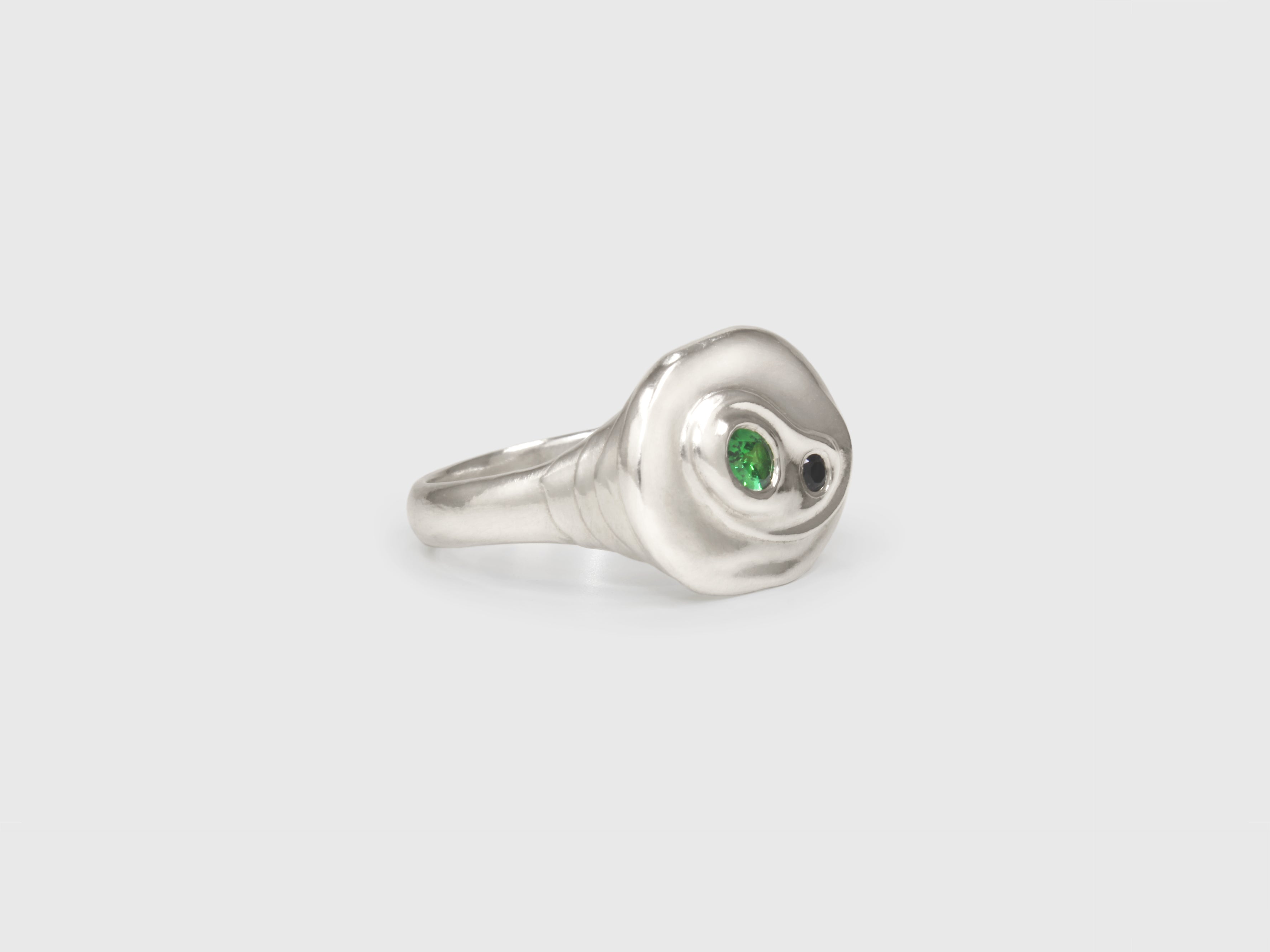 Liquid flows in a circular current and drips gently over the edge. A tsavorite garnet and black spinel appear adrift in the motion.