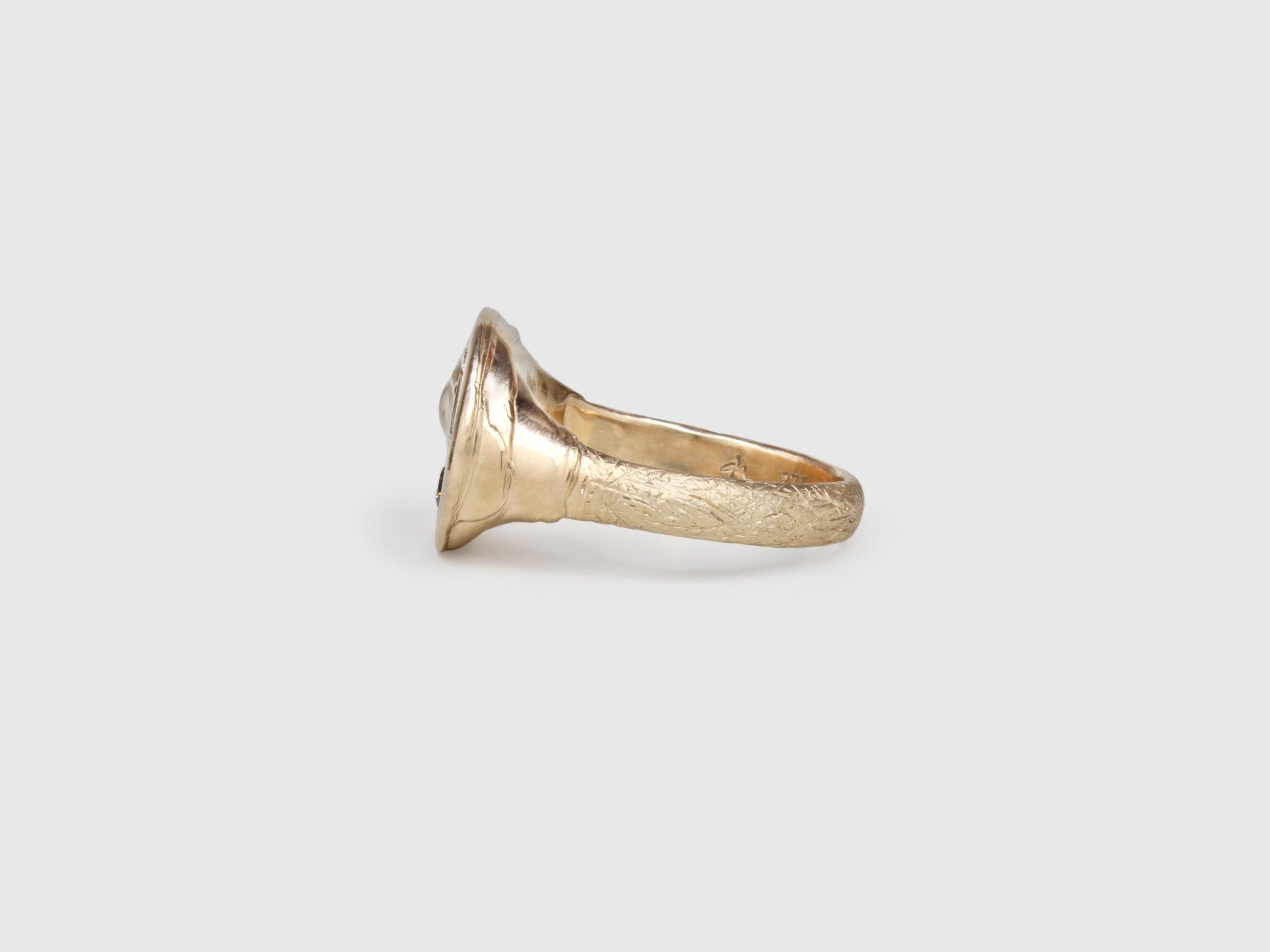 Frozen rippling fluid captured in silky yellow gold spills over a textured band. A deliciously pleasing combination of textures makes for a truly luxurious and eye catching piece.