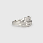 A square signet appears to emerge like a rock from a silken sand drift, exposing a diamond embedded in its textured foundation. A unique and experimental take on a classic style using the finest materials.