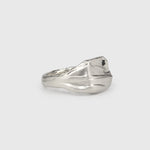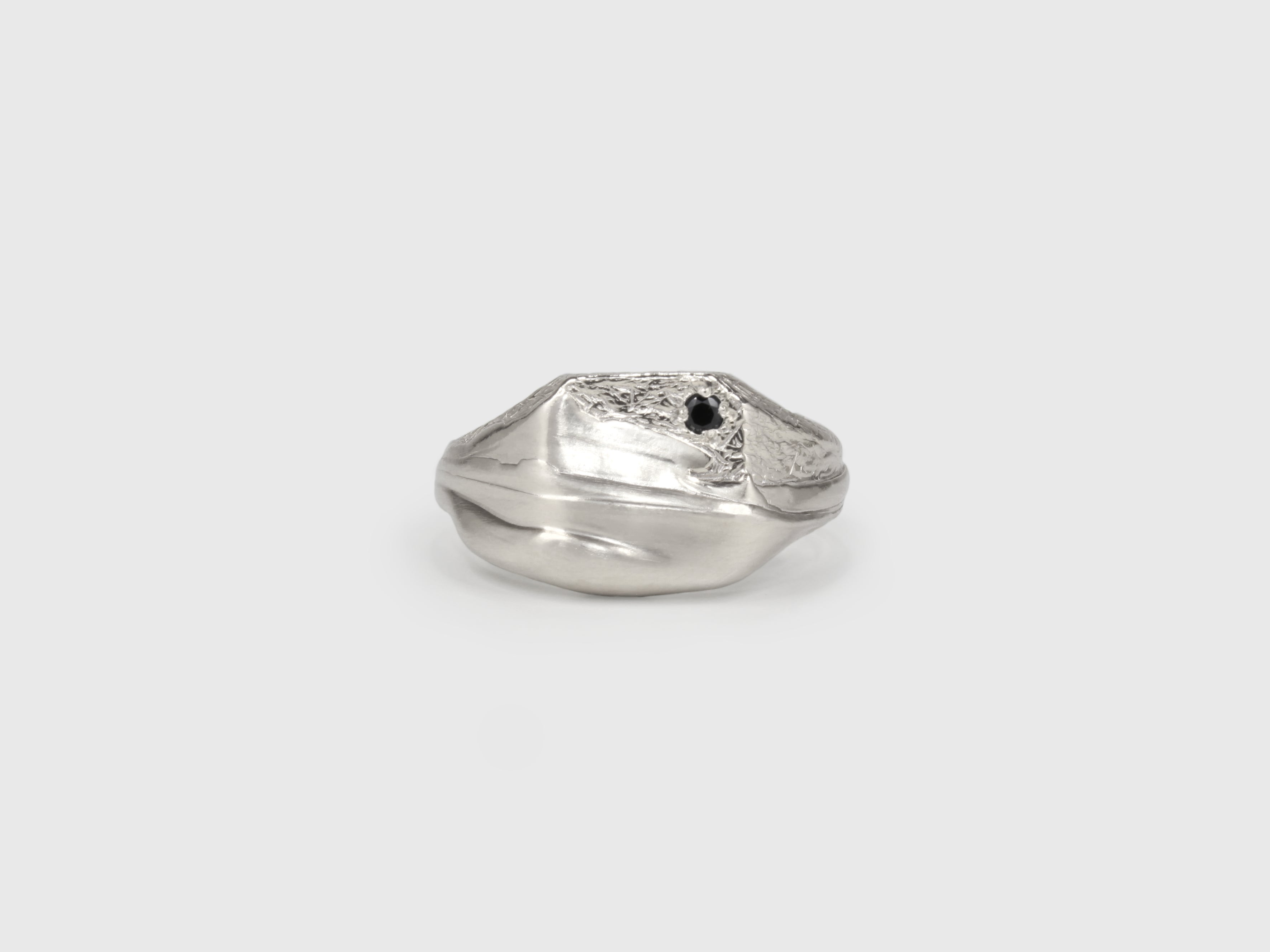 A square signet appears to emerge like a rock from a silken sand drift, exposing a black spinel embedded in its textured foundation. A unique and experimental take on a classic style.