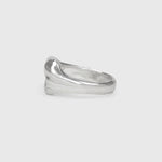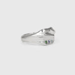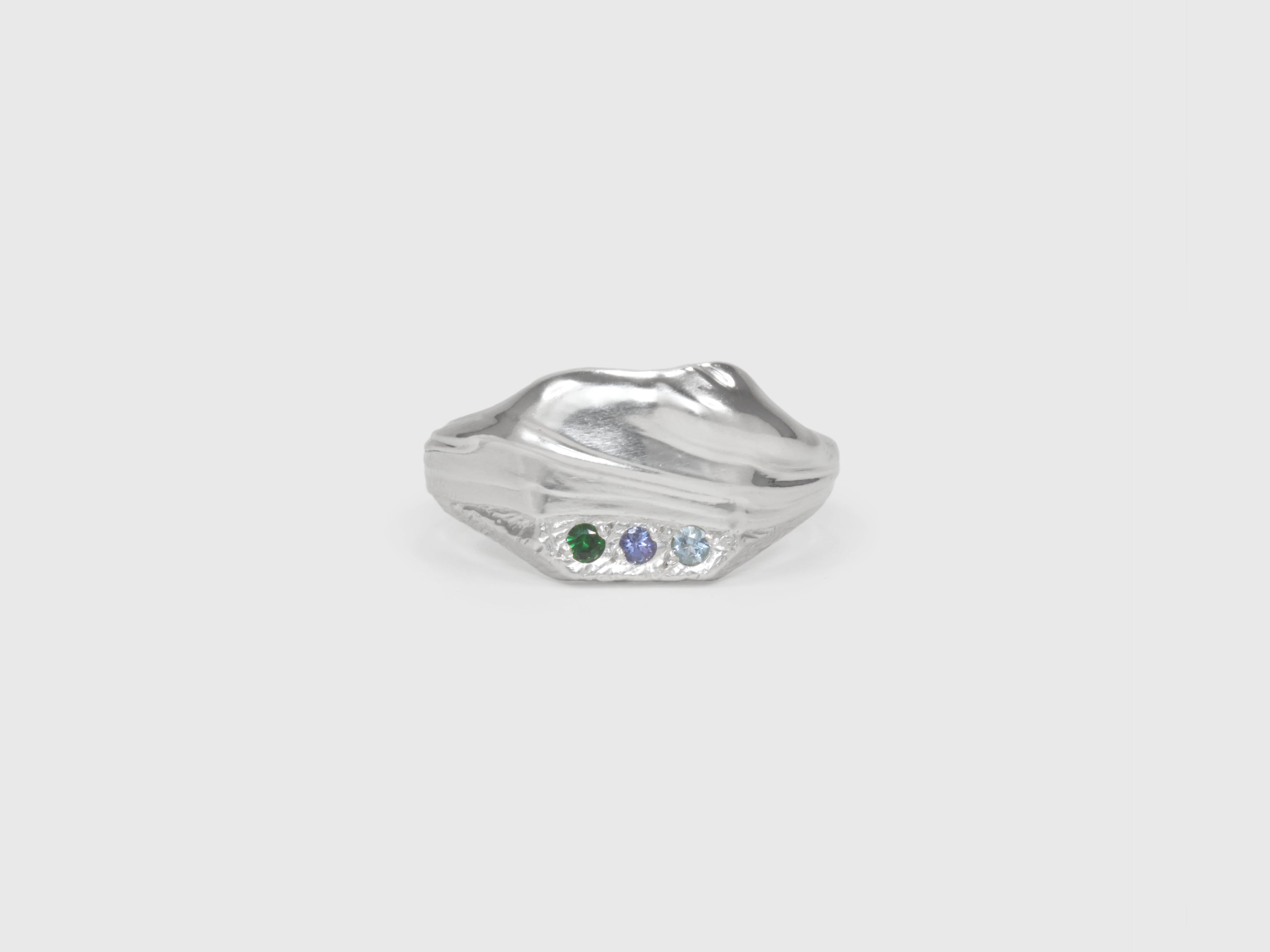 A square signet appears to emerge like a rock from a soft dune, exposing a row of gems embedded in its textured foundation. A unique and experimental take on a classic style.