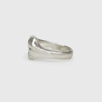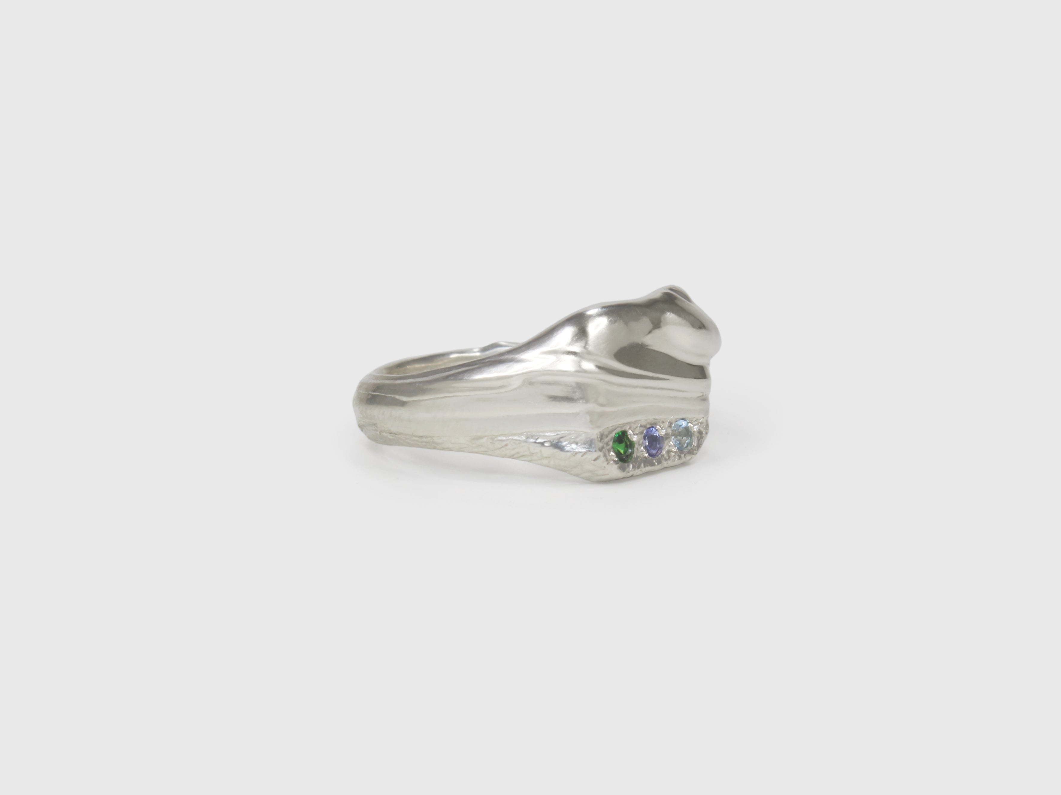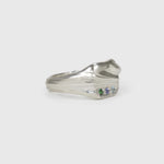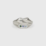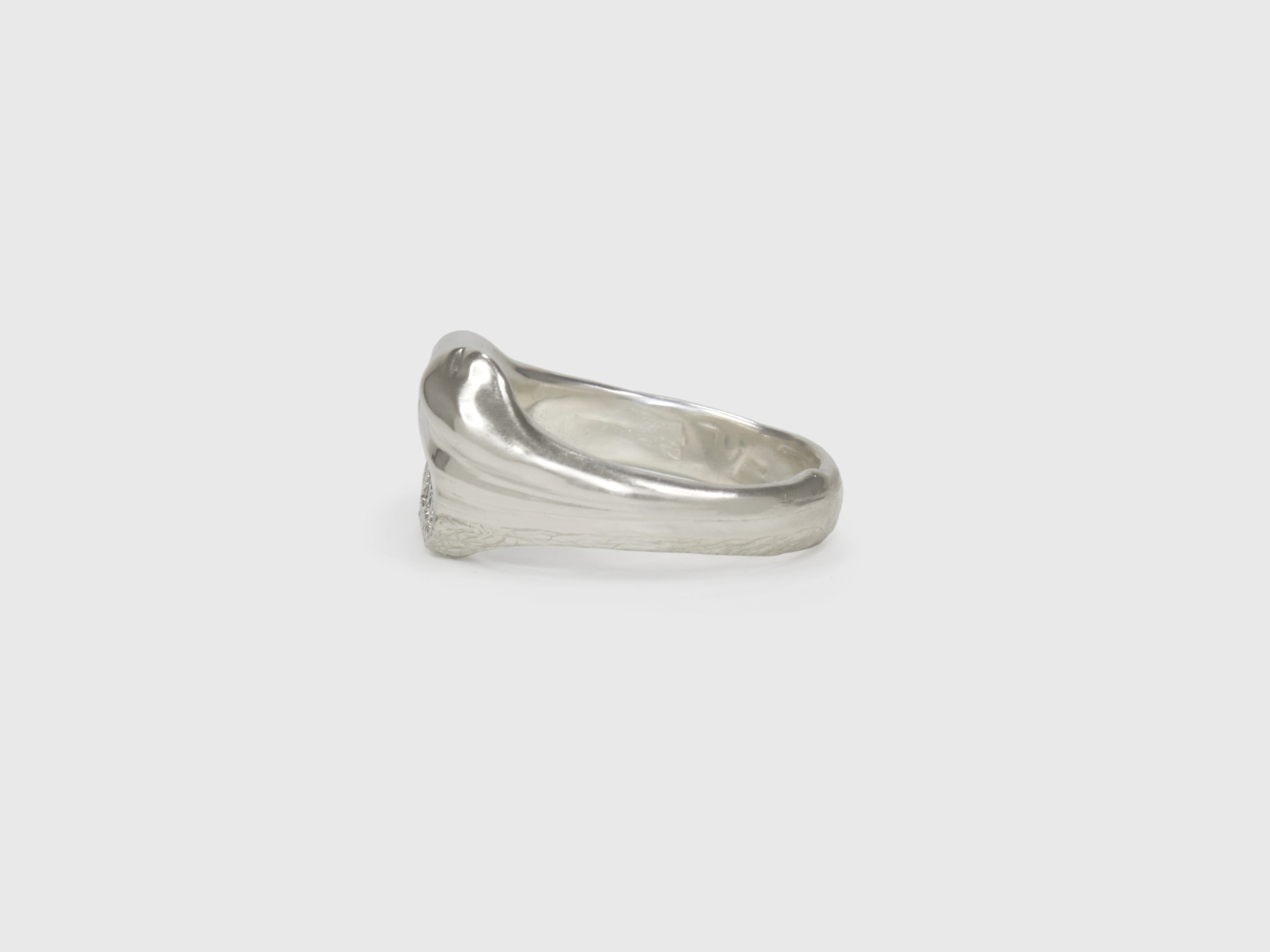 A square signet appears to emerge like a rock from a soft dune, exposing a row of gems embedded in its textured foundation. A unique and experimental take on a classic style.