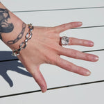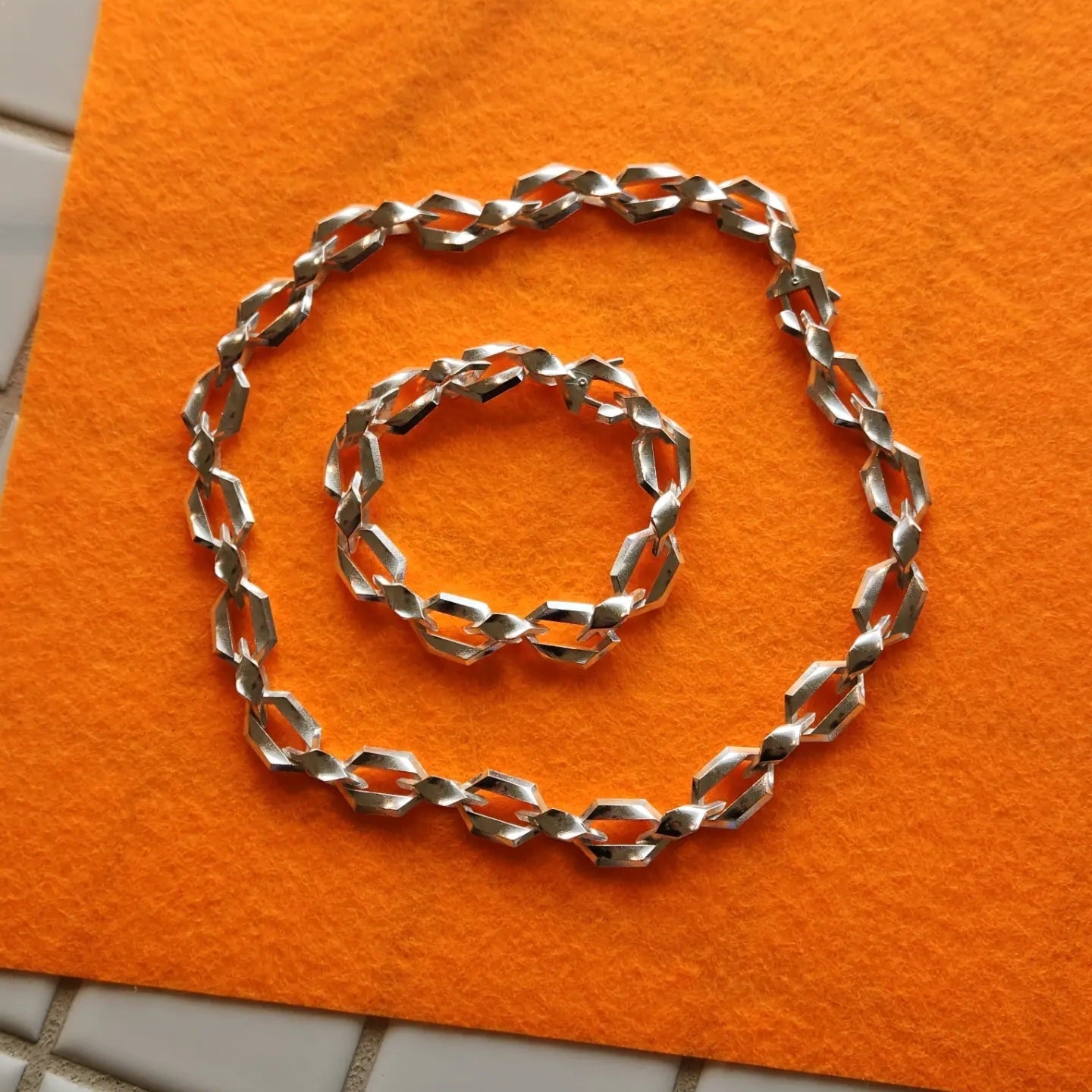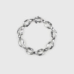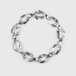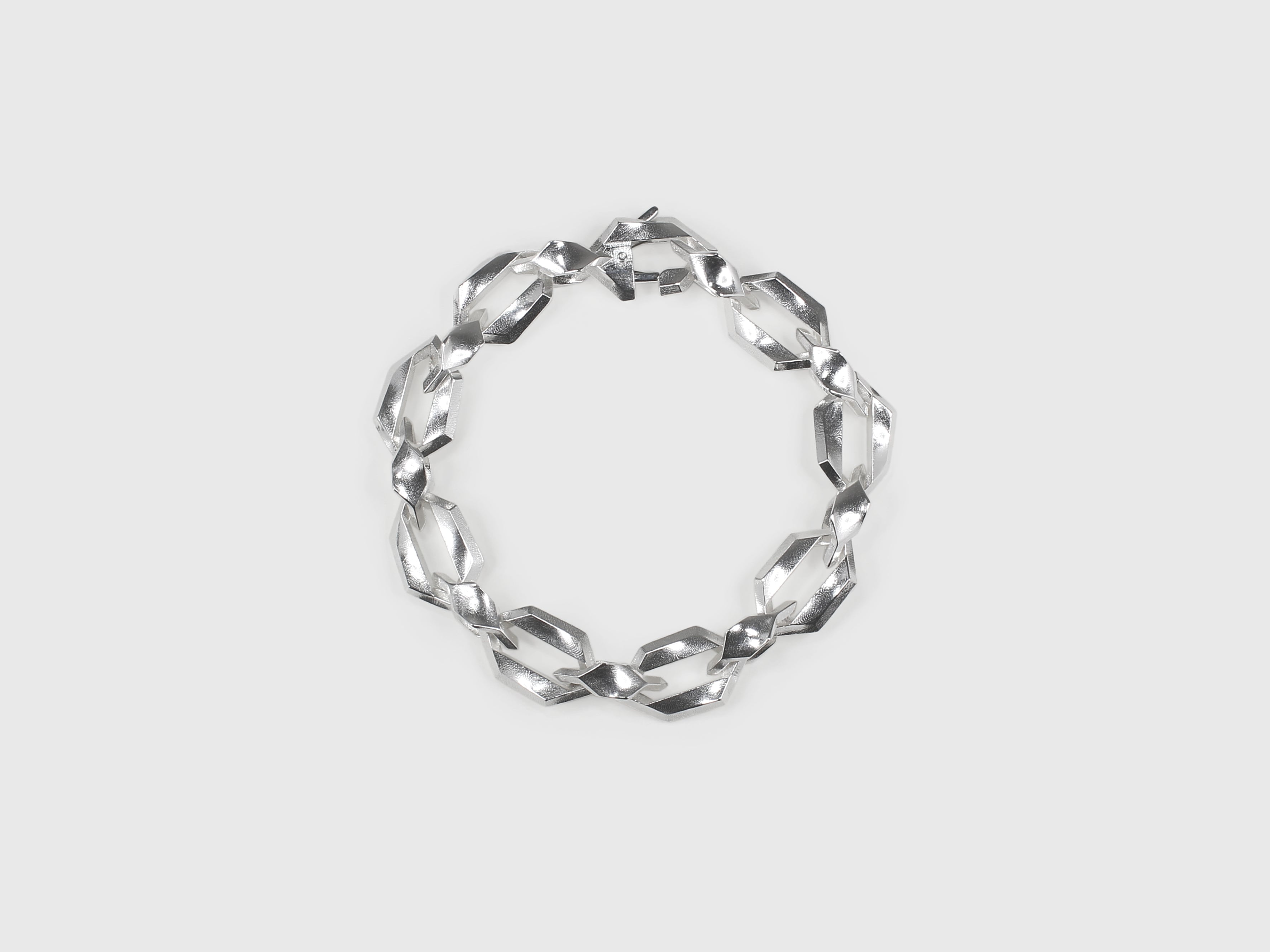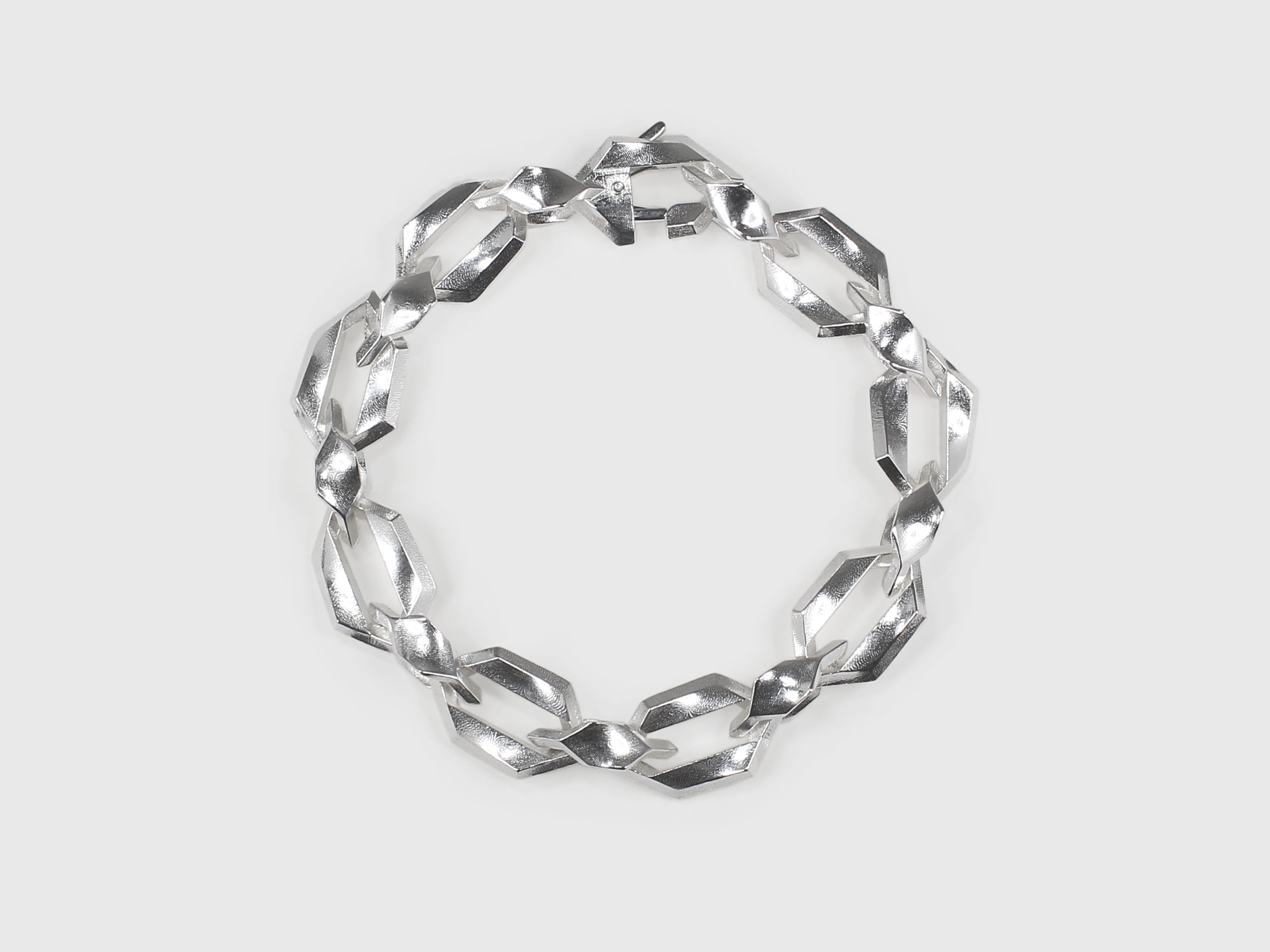 Rigid geometry undulates under torsion in this study of structure and distortion. A departure from the traditional curb chain with special attention paid to the retention of marks from the manufacturing process.