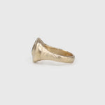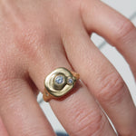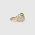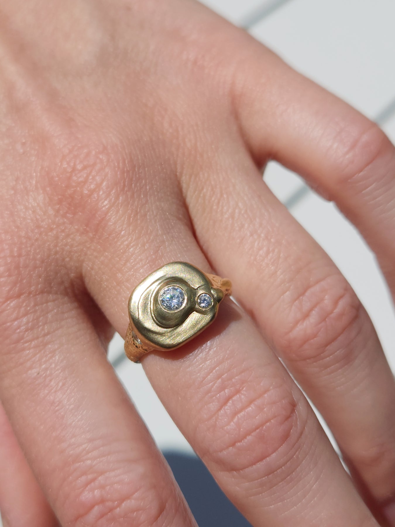 In a luxuriously tactile play on the phases of matter, a soft square signet is gouged and dipped. Seemingly viscous gold pools and dribbles slowly over one shoulder. Brilliant white diamonds sink and settle into the satin surface.