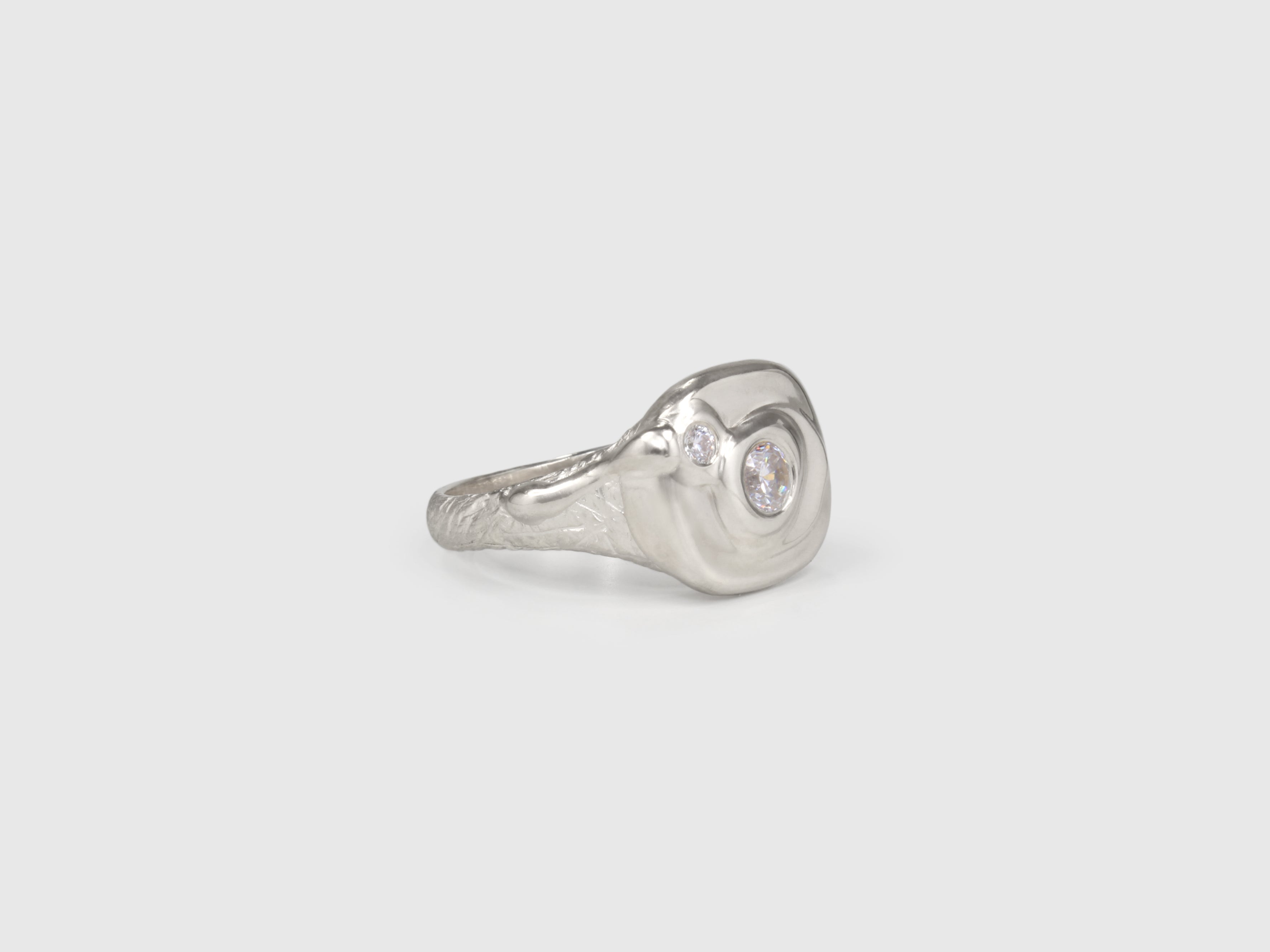 In a luxuriously tactile play on the phases of matter, a soft square signet is gouged and dipped. Seemingly viscous gold pools and dribbles slowly over one shoulder. Brilliant white diamonds sink and settle into the satin surface.