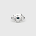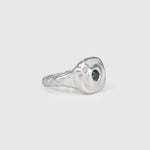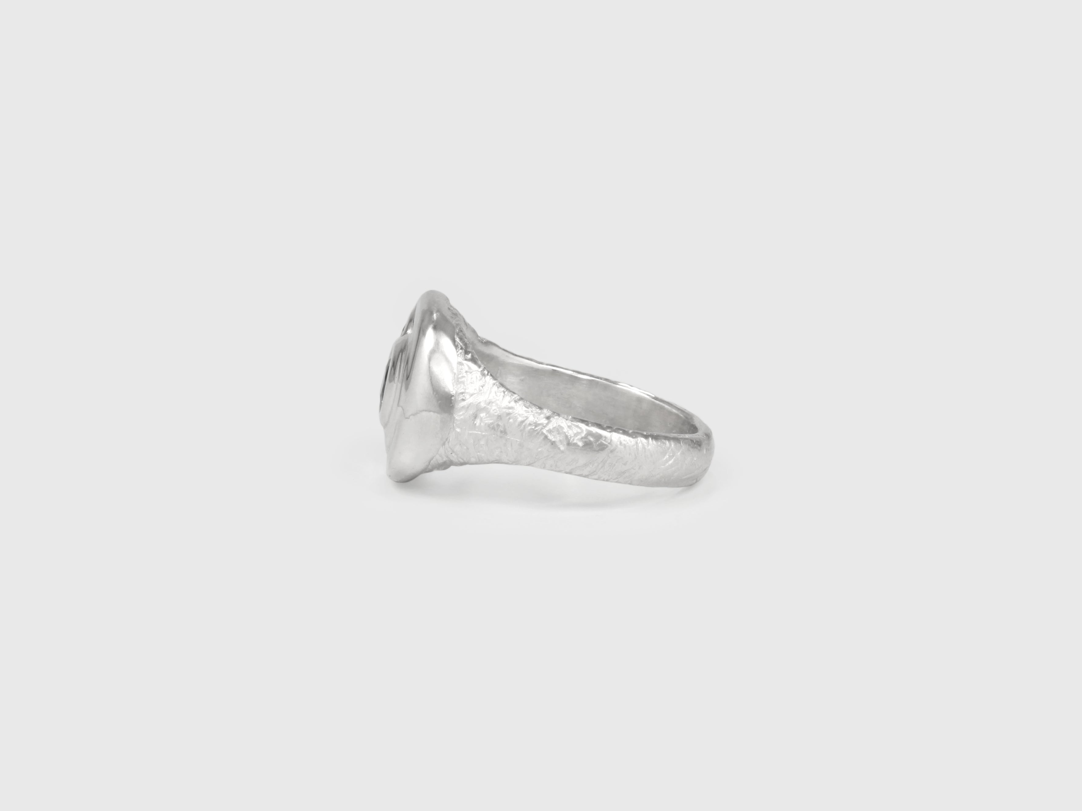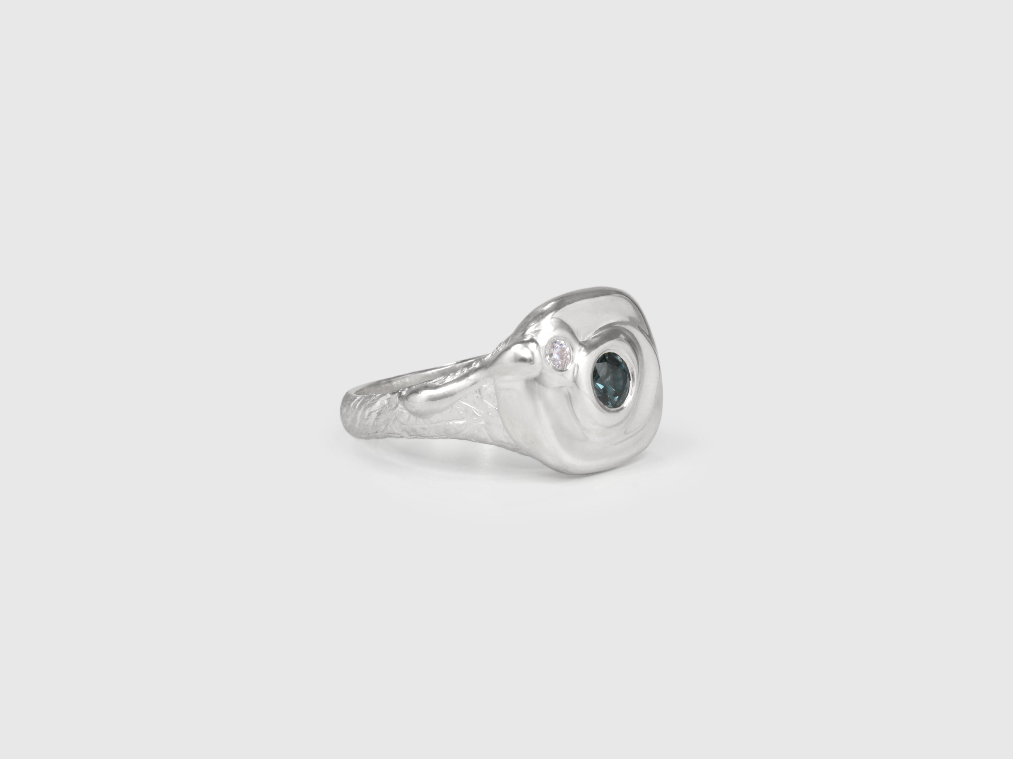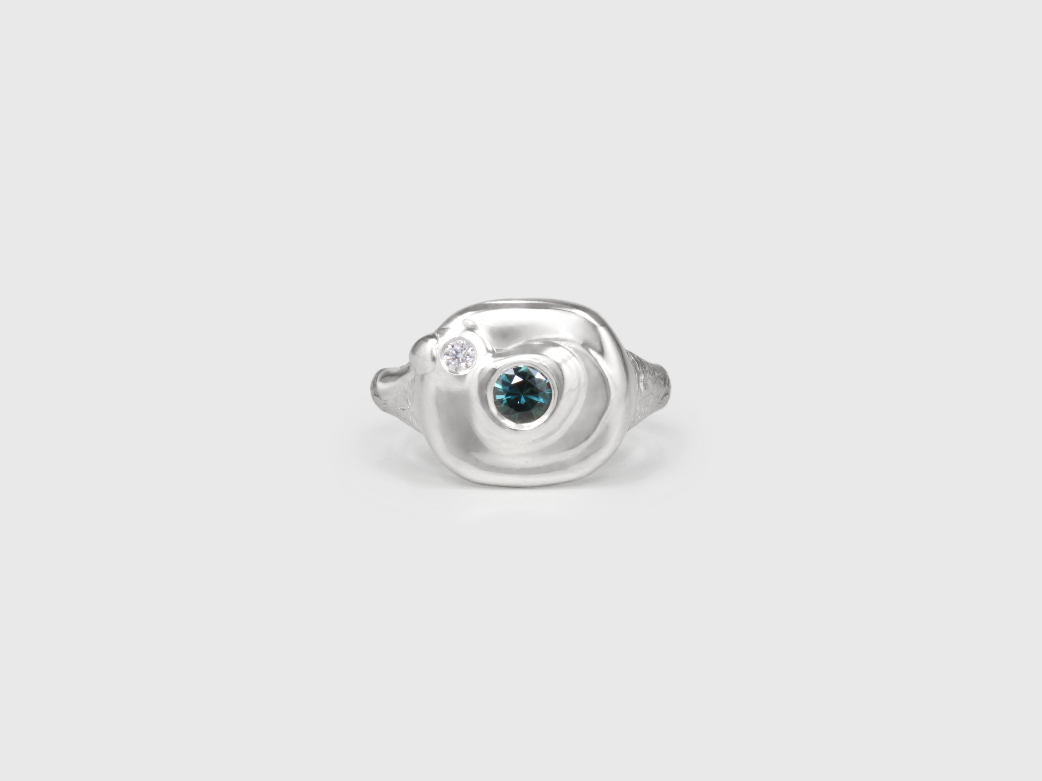 In a luxuriously tactile play on the phases of matter, a soft square signet is gouged and dipped. Seemingly viscous metal pools and dribbles slowly over one shoulder. Sparkling gems sink and settle into the surface.