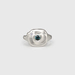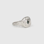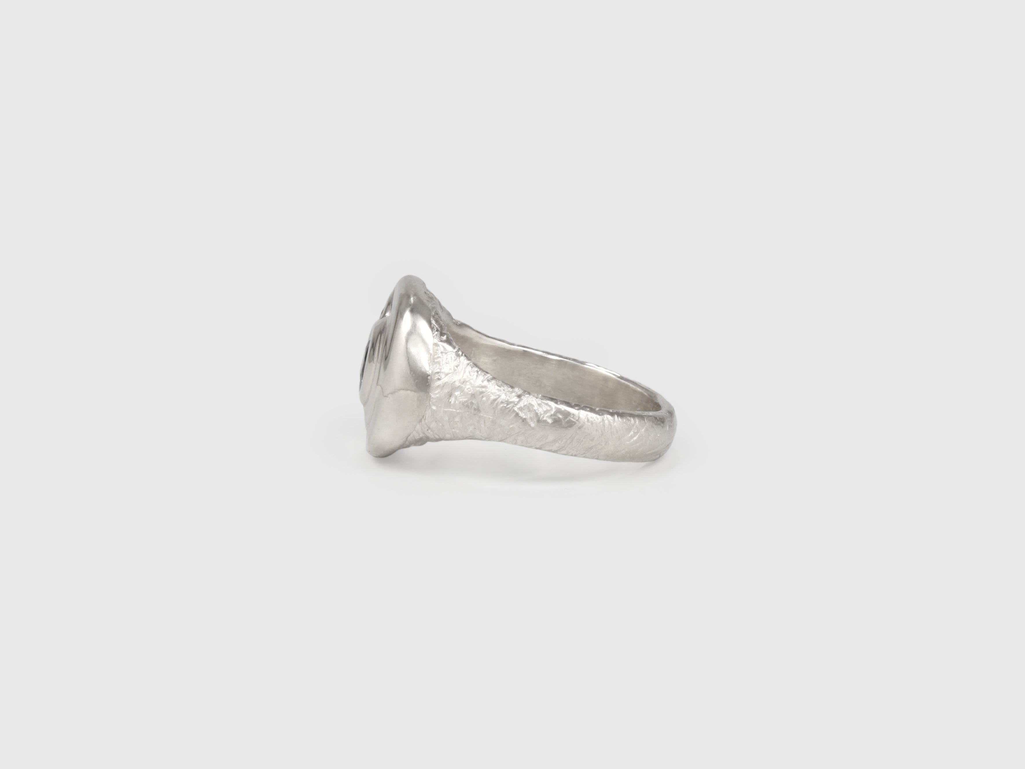 In a luxuriously tactile play on the phases of matter, a soft square signet is gouged and dipped. Seemingly viscous metal pools and dribbles slowly over one shoulder. Sparkling gems sink and settle into the surface.