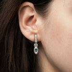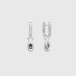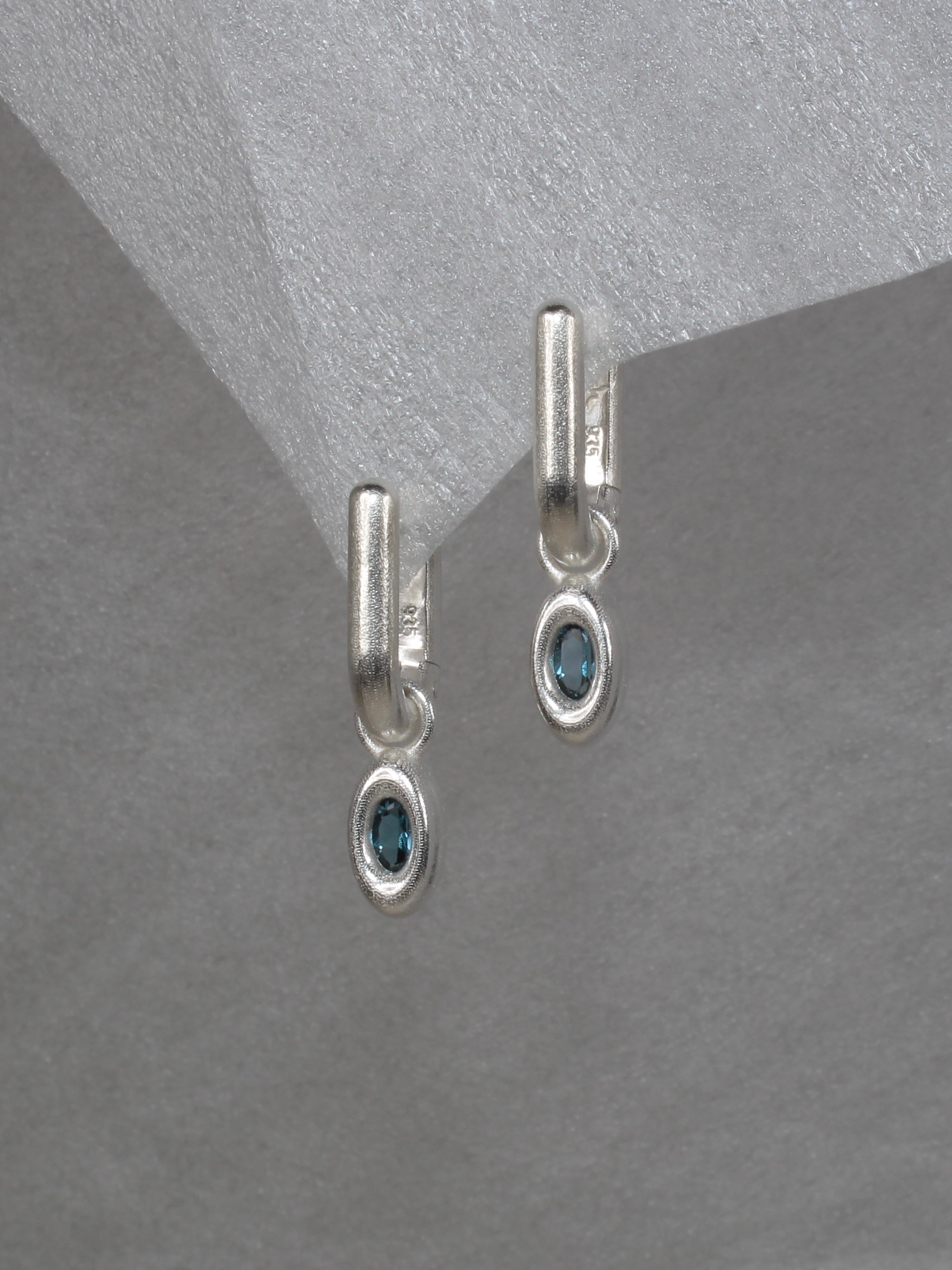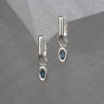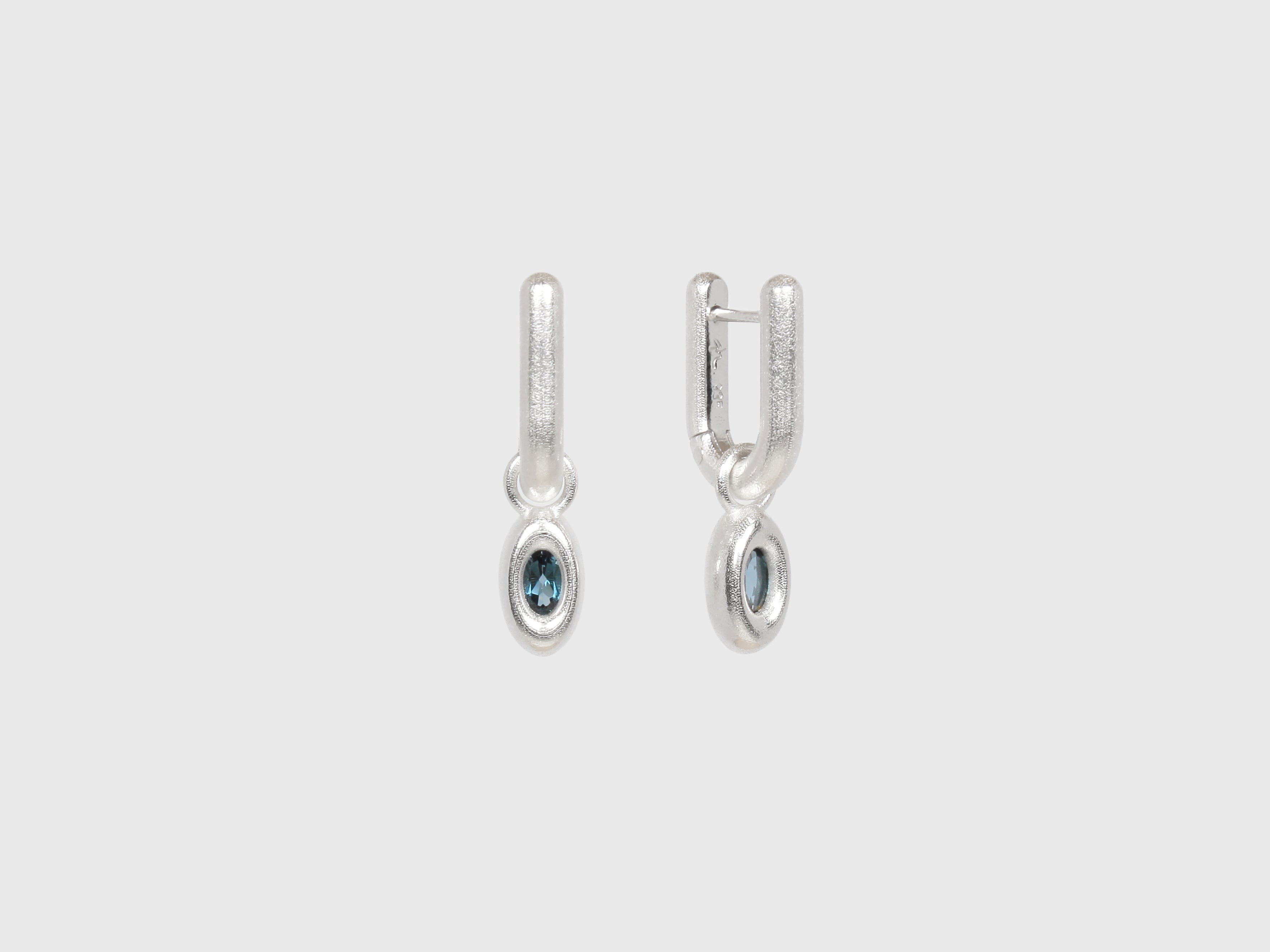 A pair of oval London blue topaz are captured in our signature Bonded setting and suspended from hinged U shaped earrings that hug the ear. Thoughtful design that speaks of lasting connection. Crafted in Argentium silver.